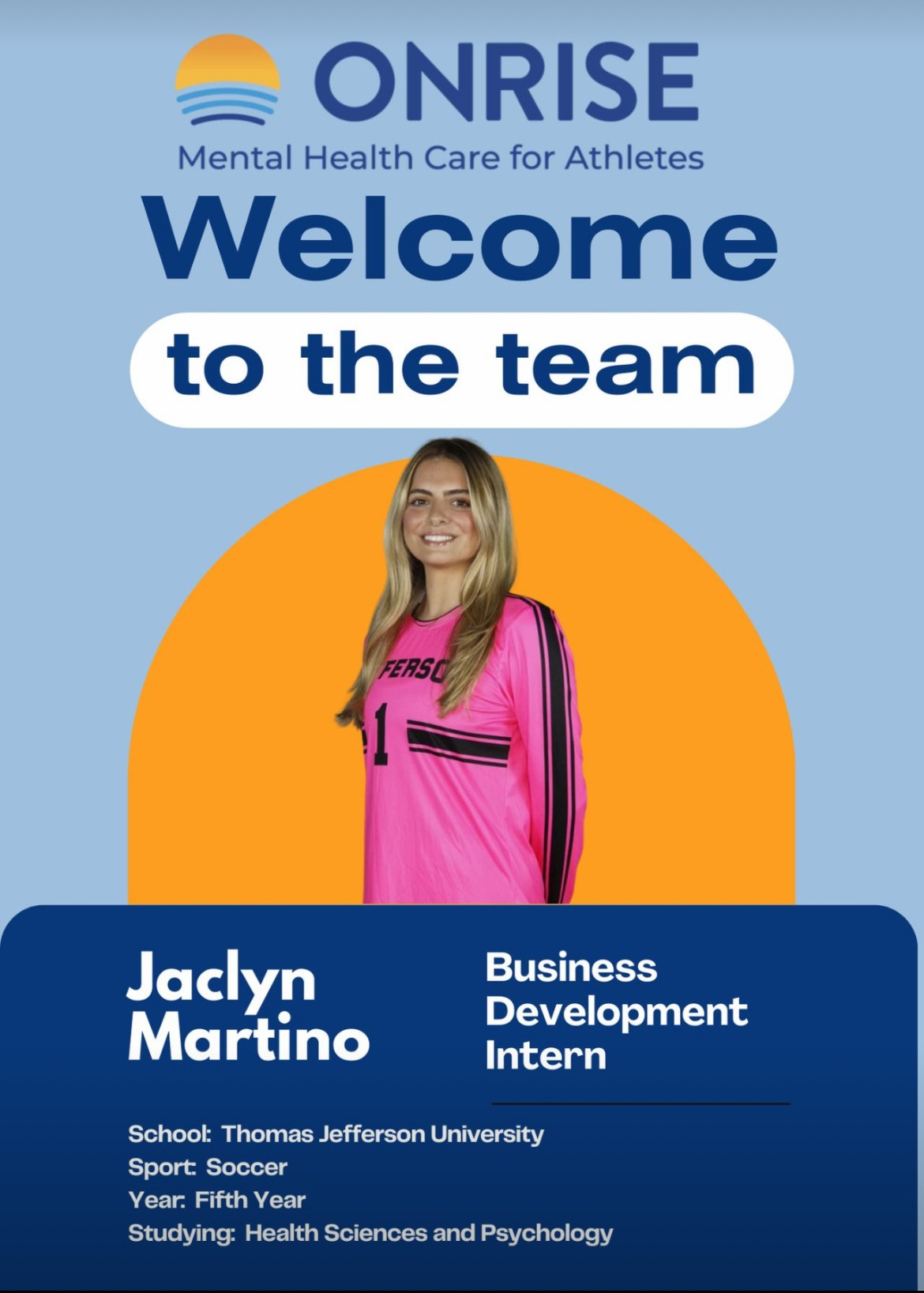 My name is Jaclyn Martino, a 5th year senior with the Thomas Jefferson Women’s Soccer program. This summer at Onrise, I have learned a lot about what goes into providing mental healthcare to athletes across multiple sports from youth to professional.